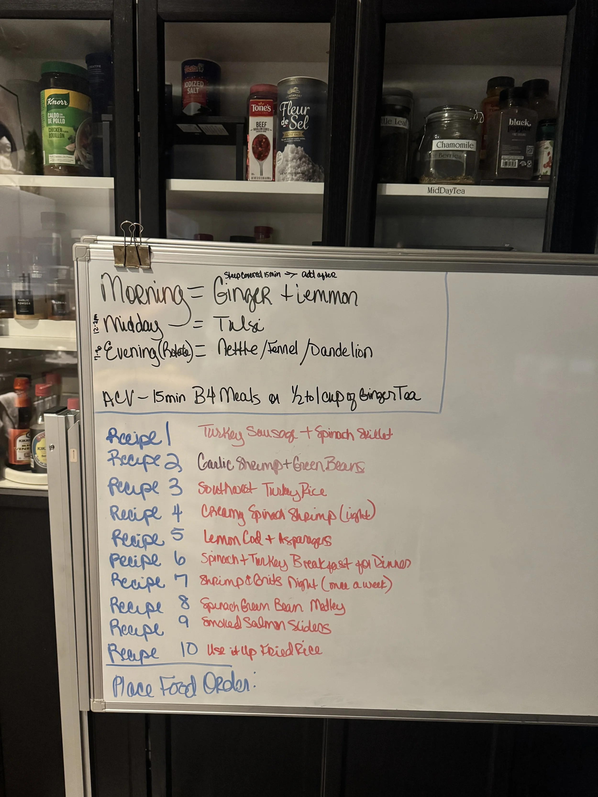 Then after I had all my meals I printed them out & taped them to my whiteboard so I couldn’t mess this up. They are there in my face….